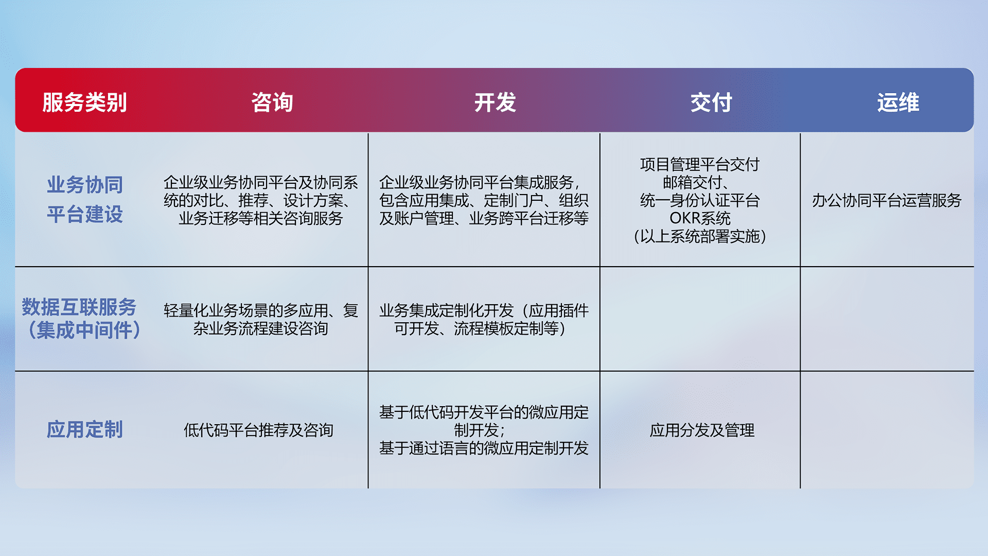 针对钉钉、、、企微、、IDaas等平台级产品提供产品的规划、、、、方案、、、、交付、、、定制化开发等服务,,,实现如统一协同办公、、、智能客户服务、、混合会议管理、、、智能数据查询、、等业务场景,,,实现数字化转型。。。。
